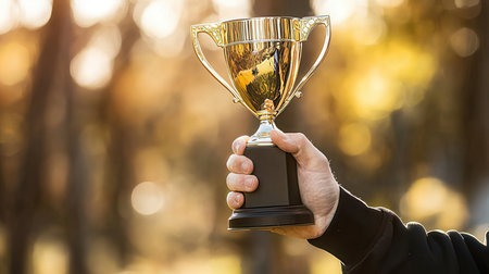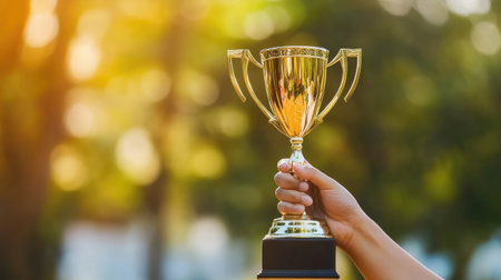 A hand proudly holds a gleaming golden trophy against a blurred outdoor background. This image symbolizes achievement and celebration of success, perfect for various uses.