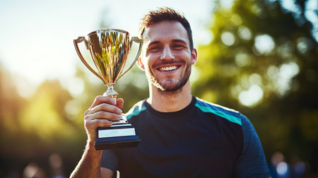 A proud athlete smiles broadly while holding a championship trophy outdoors, illuminated by golden hour light, capturing a moment of victory and pure joy in sports.