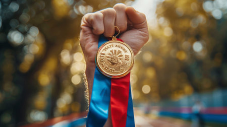 A hand holding a gold medal with a red ribbon. sports competition concept
