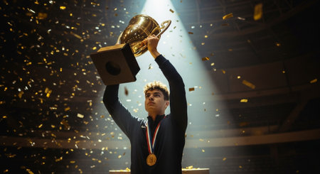 Triumphant hands hold trophy in confetti shower, celebrating victory without logos or text
