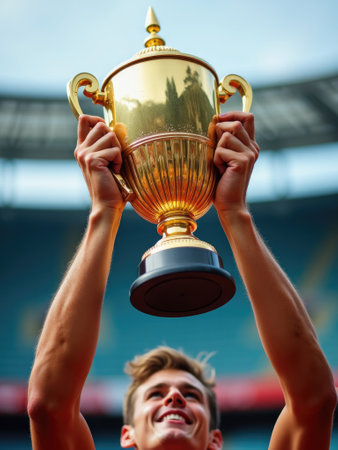 A victorious athlete raises a gleaming gold trophy in an expansive stadium, capturing the joy and pride of a hard-fought victory under the clear blue sky in sports competition.