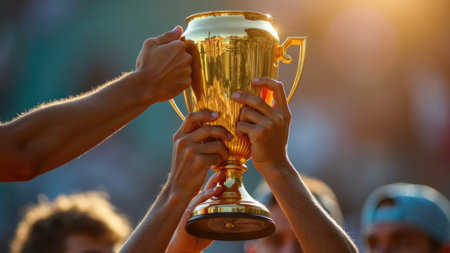 Multiple hands collectively lifting a golden trophy during sunset, symbolizing unified victory and teamwork in an outdoor setting with warm, celebratory ambiance.