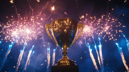 A stunning golden trophy illuminated by vibrant fireworks. This captivating scene symbolizes achievement and celebration, creating a festive atmosphere for any victorious occasion.