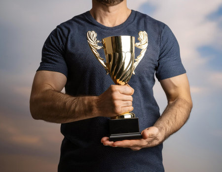 Close up image of a person holding a trophy, symbolizing achievement, success, and victory.
