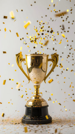 Golden trophy surrounded by falling confetti, symbolizing victory, honor, and a festive celebration