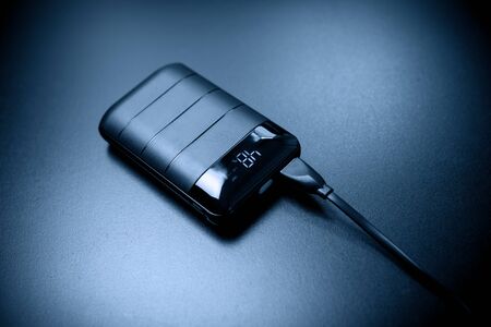 Black power bank connected with USB cable. Shallow depth of field focused on power bank display.