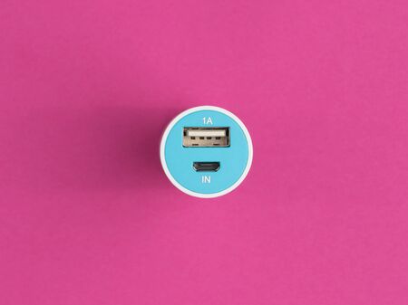 Charging power bank. Portable powerbank with white usb cable for charger mobile phone or smartphone battery. Modern technology concept in top view