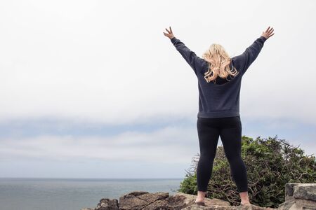 Adult blonde female woman raises her arms up giving peace sign on Wedding Rock in Patrick's Point State Park in Trinidad, California, on a foggy summer day