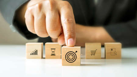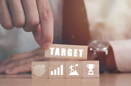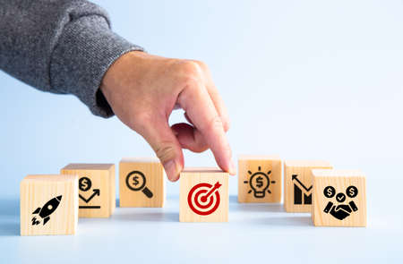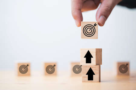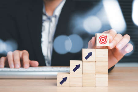Businessman arranging wood block with target icon and business icon for strategy, action plan, growth business ,success process concept.