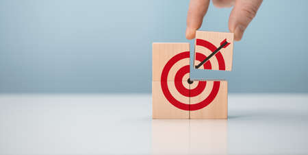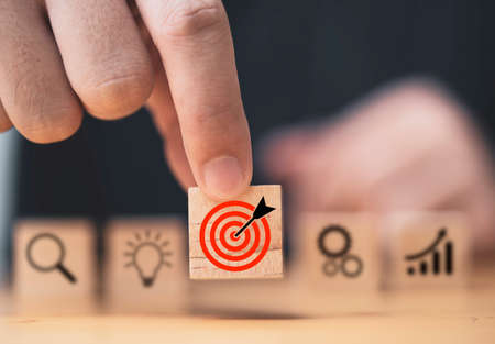 Arrow and target symbols on wooden blocks with a businessman's hand and target symbol.
