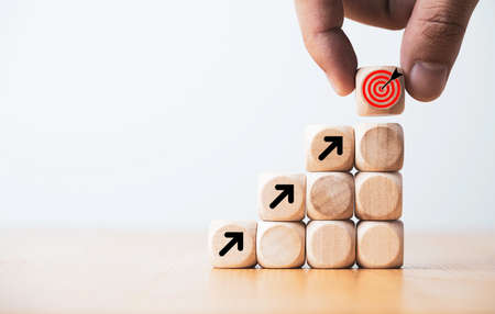 Business achievement goal and objective target concept. Hand man arranging wooden cube block. Business goal and success concept. Focus on a goal and achieve successful business. Copy space.