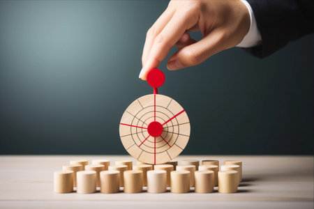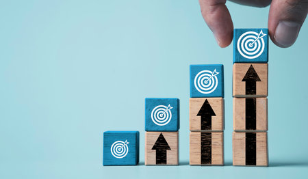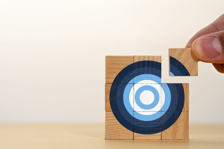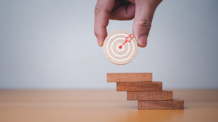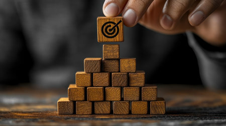 A hand carefully places a wooden block featuring a target symbol on top of stacked blocks, symbolizing strategic growth and achievement in business goals.