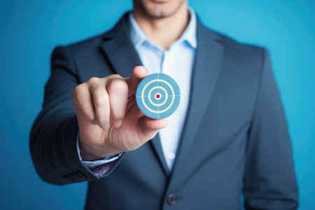 A red dart is being placed into the middle of a circular target in the right hand of a man in a suit. Concep's goal is to attain it.