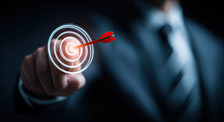 An image shows a person's hand with a dart hitting the center of a glowing target. The composition features a shallow depth of field, with soft lighting and a dark background. This visual could be used to illustrate concepts related to business, strategy, achievement, and goals in various commercial projects.