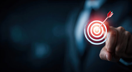 A close-up shot presents a hand pointing towards a glowing target with an arrow. The composition features vibrant red and white against a blurred dark background. The scene suggests a concept of goal achievement and success suitable for various commercial and editorial applications. The image is likely captured indoors, with artificial lighting enhancing the visual impact.