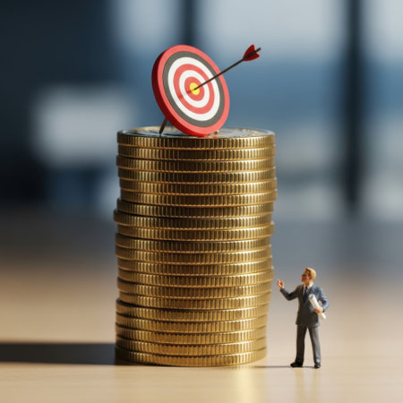 A conceptual image where a miniature businessman figurine stands next to a tall stack of gold coins. On top of the coin stack, a small red and white target has an arrow firmly hitting the bullseye, representing financial success and goal achievement. The businessman looks up and points towards the target, emphasizing ambition and focus on financial objectives and wealth accumulation.