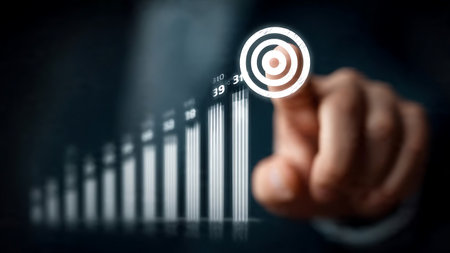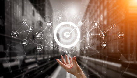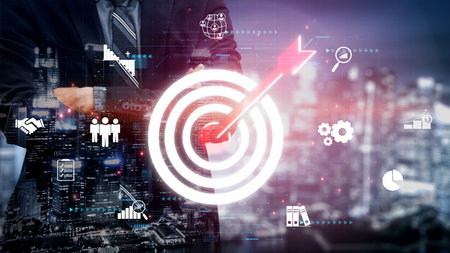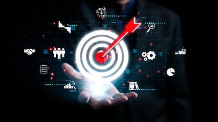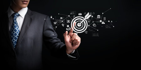 A business professional showcases the concept of achieving targets with a hand gesture, surrounded by digital icons representing analytics, growth, and success-focused strategies.