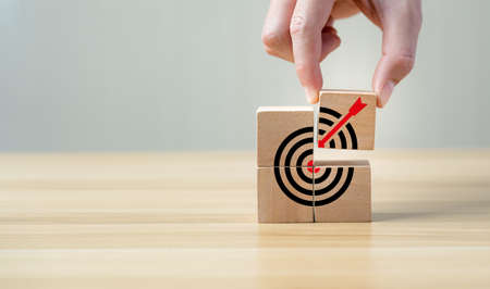 Business achievement goal and objective target concept. Hand man arranging wooden cube block with DART GOAL TARGET. Business goal and success concept. Focus on a goal and achieve successful business.