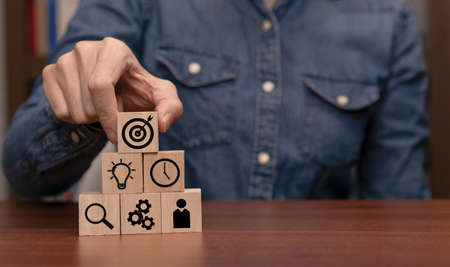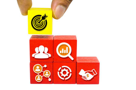 Businessman hand arranging wood block with icon business strategy and Action plan. Targeting the business concept.