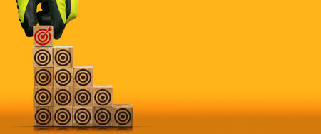 Gloved hand arranging wood blocks with many empty brown targets and one red one with an arrow reaching into the center, on an orange and yellow background with copy space.