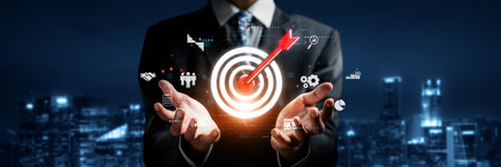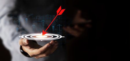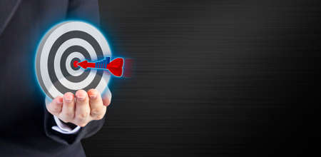Businessman holding virtual red dartboard with arrow for setup business objective target concept.