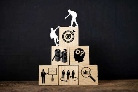 Wooden blocks placed on piles of coins. Concept of goals, business goals to be successful. Icon related to business success, above people helping each other.