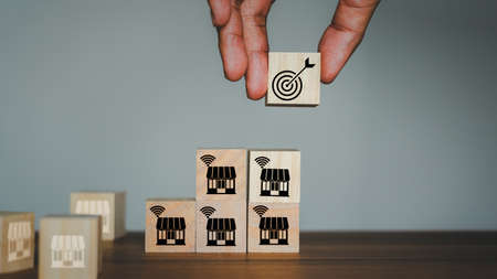 Business ideas about online store expansion. Hand holding wooden cube block with target and online store icon. Business growth in concept.