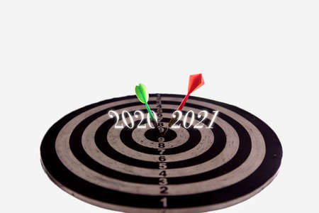 Business and finance concept. On a pink background, a man's hand holds a red dart with the inscription 2021.