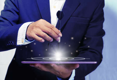 A young businessman uses the darts embroidered onto the tablet abstract to set goals to invest in his corporate business in his planning for the coming year.