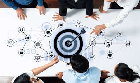 A dynamic business scene showcasing collaboration among professionals as they analyze digital connections and a target on a modern office table.
