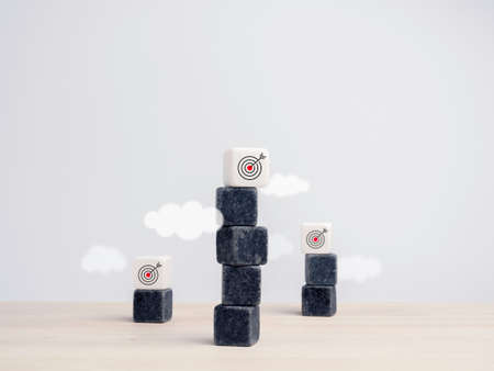 Target, different business challenge goals concept. Target icon symbol on white cube blocks on the top of black block stacks above the cloud on a wooden table on white background, minimal style.