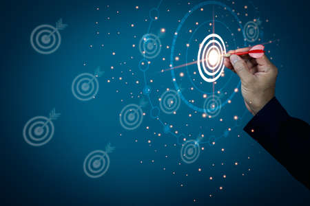 Targeting the business concept, Businessman hand holding red dart to the virtual target dartboard, Executive marketing, investment goal and target for business investment concept,