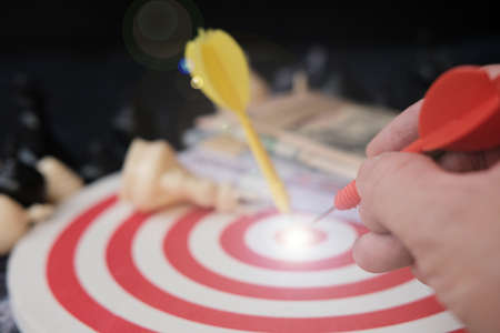 Close up shot of the dart arrow hit on bullseye, red dart arrow hitting in the target center of dartboard Target hit in the center, challenge in business marketing,Target and goal as concept.