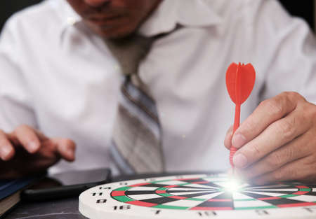 Businessman hands in black suite sitting and holding black dart put to centre of target board with stacking coin on vintage table meaning of investment and achievement goal. Plann and strategy concept