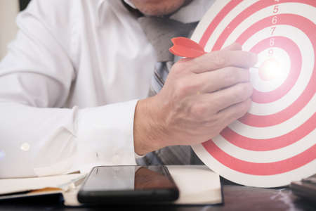 Businessman in white shirt sitting at the table with a dart board in his hand. Business concept