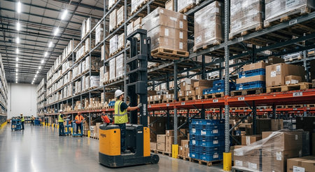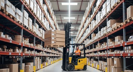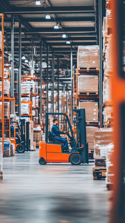 A warehouse worker operates a forklift to move pallets in a busy distribution center during daylight hours