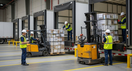 Warehouse workers with forklift loading and unloading boxes in warehouse