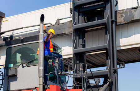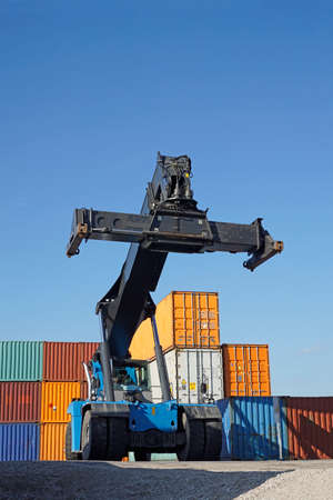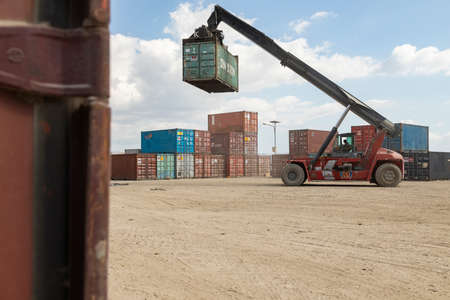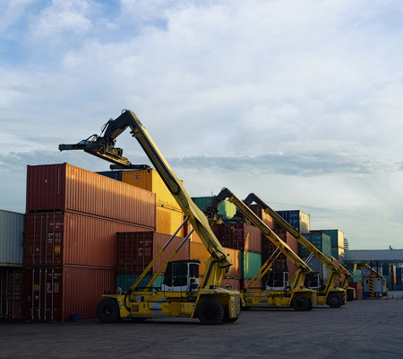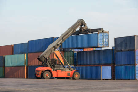 Three lift stacker in depot handling container box loading at the Docks with Truck.