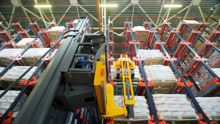 A panoramic view of a high-tech warehouse featuring automated systems, tall racks filled with various goods, and efficient logistics operations for modern supply chain management.