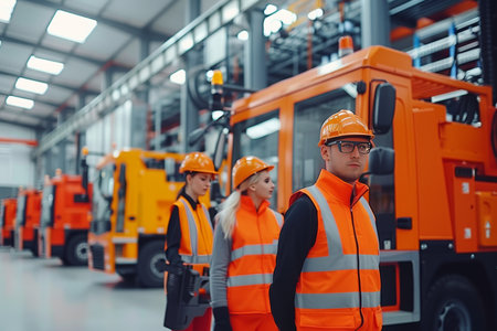 People in vests and work helmets work in a logistics warehouse. Trucks are waiting for their turn