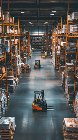 Forklifts maneuvering through a busy warehouse filled with stacked pallets during the daytime in an industrial setting