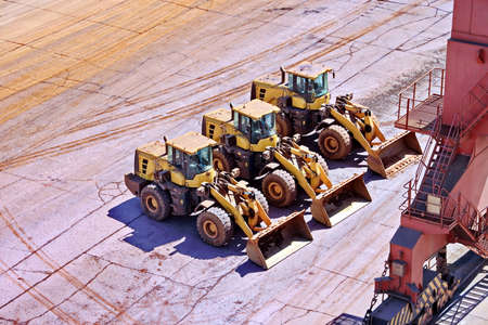 Large parking lot with big yellow mining truck, bulldozers for coal industry, ore and gold. Concept sale of industrial equipment. Aerial top view
