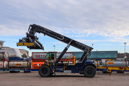 Kiel, Germany - 01. December 2025: Reach stacker lifting a tank container in a busy shipping port, representing global logistic operations and cargo trade