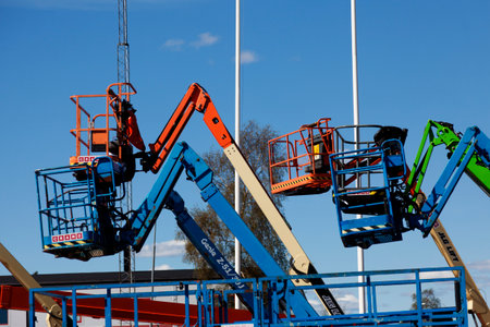 Umea, Norrland Sweden - May 20, 2021: lots of construction cranes raised in the air