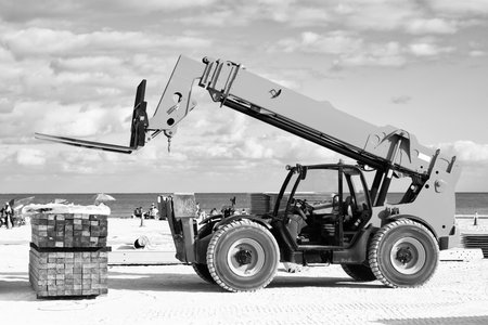 Forklift loader or stacker. Part of hydraulic and pneumatic mechanism in industrial machine. Technology in transport
