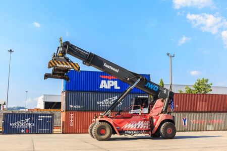 LAEM CHABANG, THAILAND - APRIL 30, 2016: The fantuzzi contstacker working at Laem Chabang Industrial Estate early in the morning in Laem Chabang, Thailand on April 17, 2015