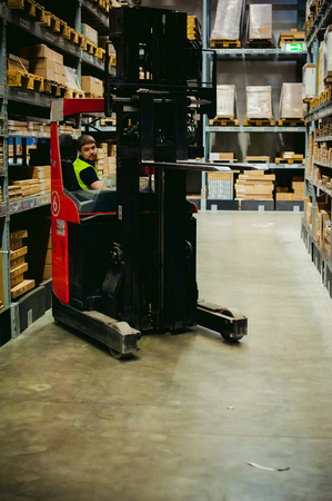 Storage. A man who arranges boxes and uses special vehicles for delivery.