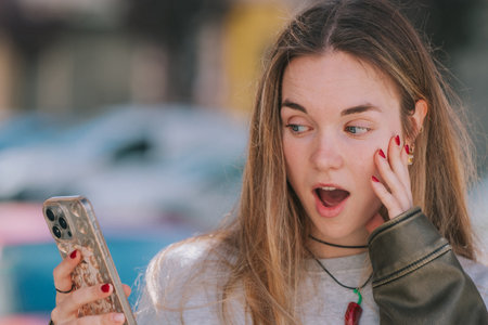 girl with mobile phone on the street with surprised expression