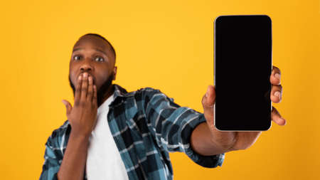 African Guy Showing Smartphone Empty Screen Over Yellow Studio Background