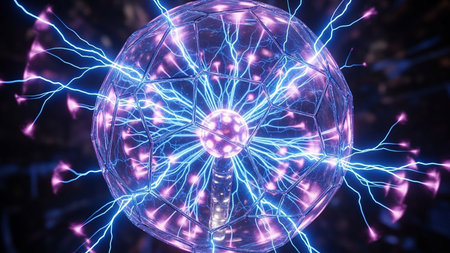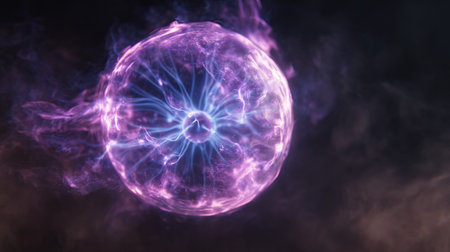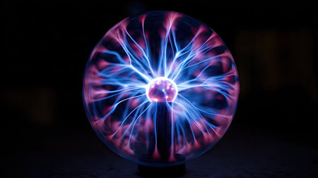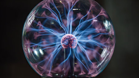 A close-up captures a plasma ball emitting vibrant blue and pink electric discharges. The spherical object glows against a dark backdrop. The composition highlights the dynamic patterns within. It could be used for illustrating scientific concepts, educational materials, or visual elements in design projects.